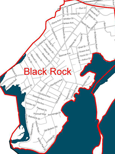 Black Rock is the southwestern- most neighborhood in Bridgeport directly east of Fairfield, CT. The neighborhood includes one historic district. Originally established as part of Fairfield, CT, Black Rock, and especially Black Rock Harbor, were once that town’s leading port. According to the bylaws enacted by the Black Rock NRZ Planning Committee, Metro North’s railroad tracks make up the neighborhood’s northern boundary; the southern boundary is the Long Island Sound (specifically, Black Rock Harbor); the eastern boundary is made up of Bostwick Avenue and Pine Street; and the western boundaries are the Fairfield town line and Ash Creek. The neighborhood consists of US Census Tracts 701, 702, and part of 703.