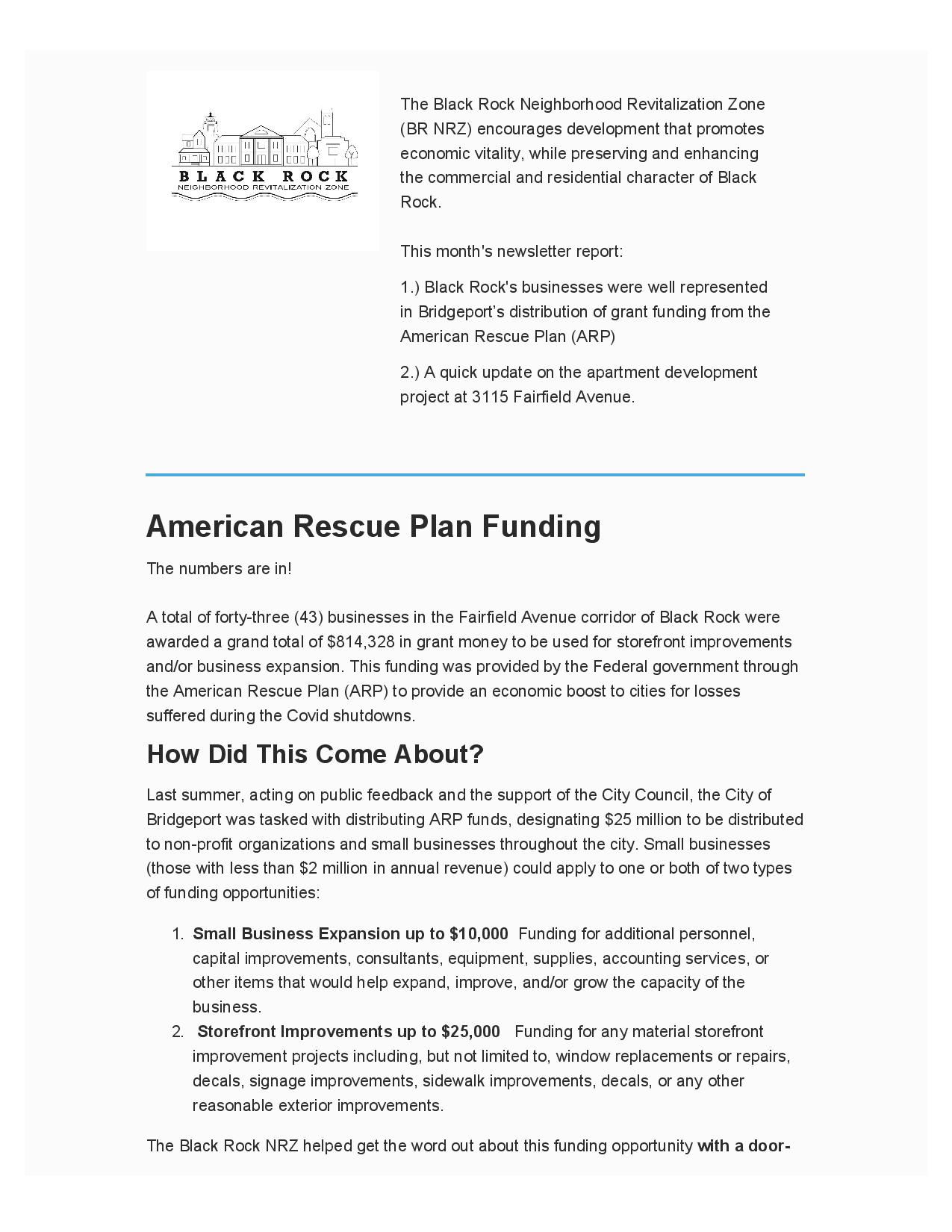 The numbers are in! A total of forty-three (43) businesses in the Fairfield Avenue corridor of Black Rock were awarded a grand total of $814,328 in grant money to be used for storefront improvements and/or business expansion. This funding was provided by the Federal government through the American Rescue Plan (ARP) to provide an economic boost to cities for losses suffered during the Covid shutdowns.